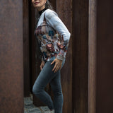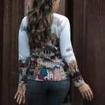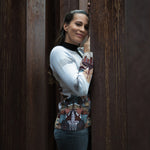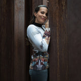 Ikonikus grafika – a „Tempera” minta karakteres, mégis harmonikus; egyedi női mintás kardigán, amely diszkréten emeli az összeállítást.