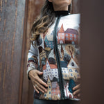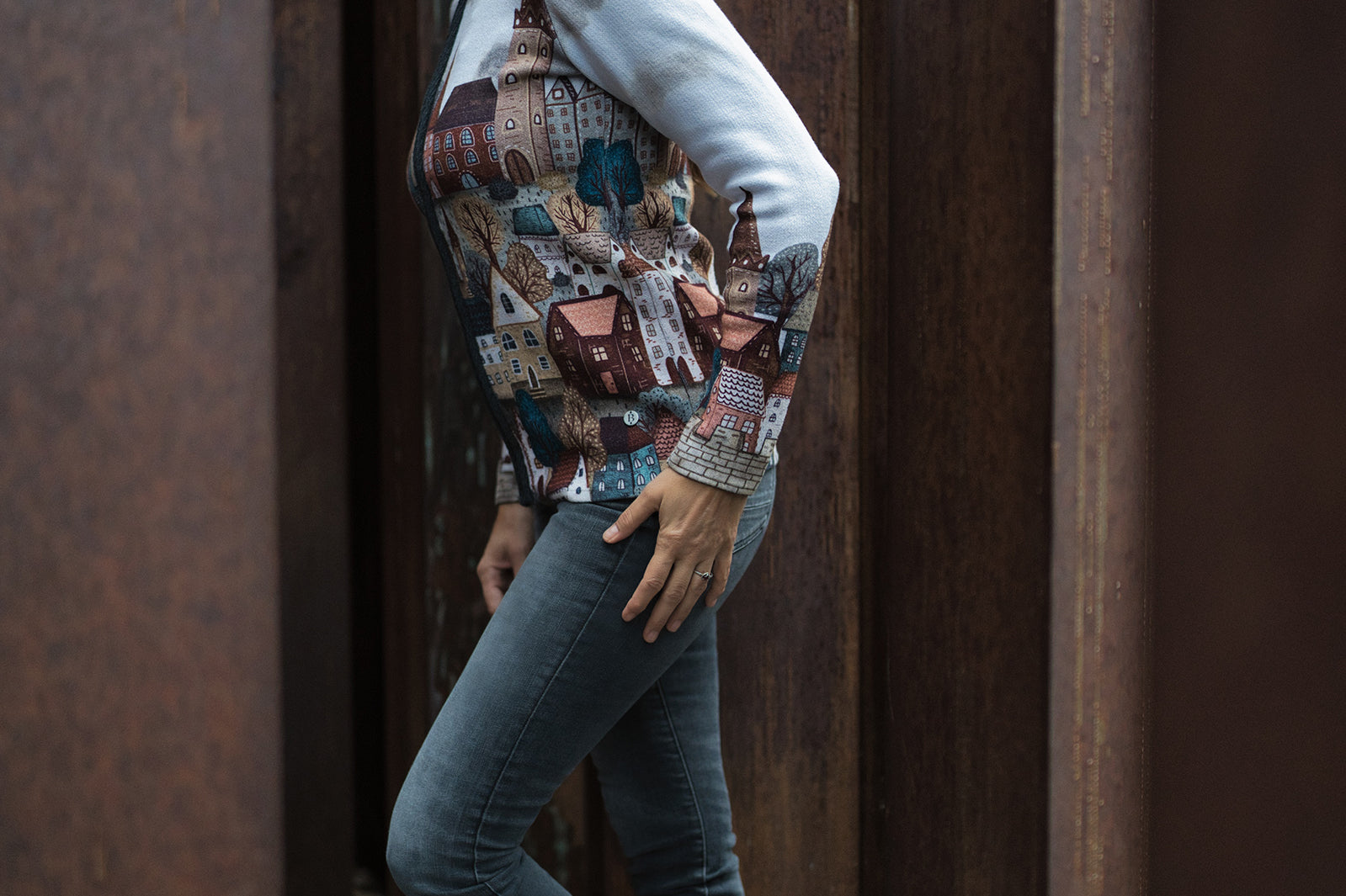 Új termékA Tempera rövid kardigán egy festményszerű, városi hangulatú mintával dolgozik: finom pasztellek, részletgazdag házikók, letisztult szabás. Kényelmes, mintás, cipzáras kötött kardigán, ami farmerhez és elegánsabb darabokhoz is jól illik.