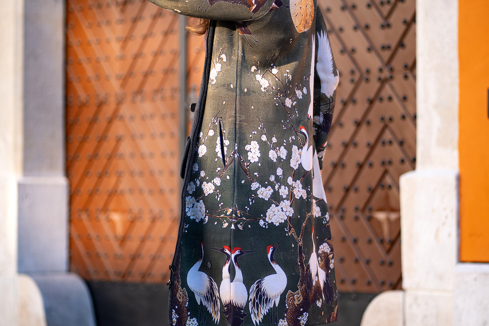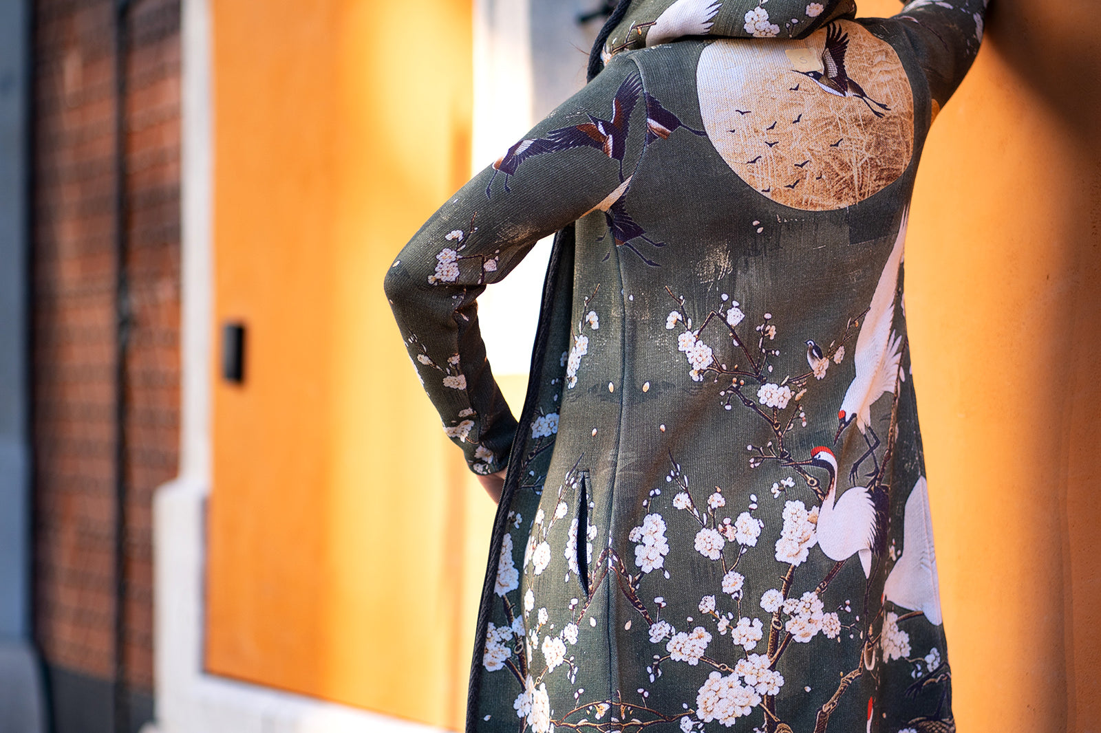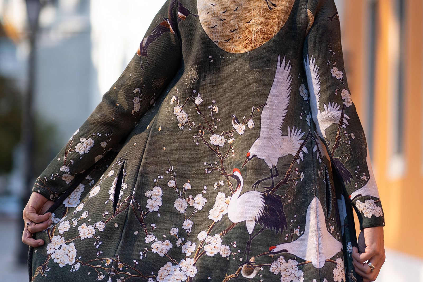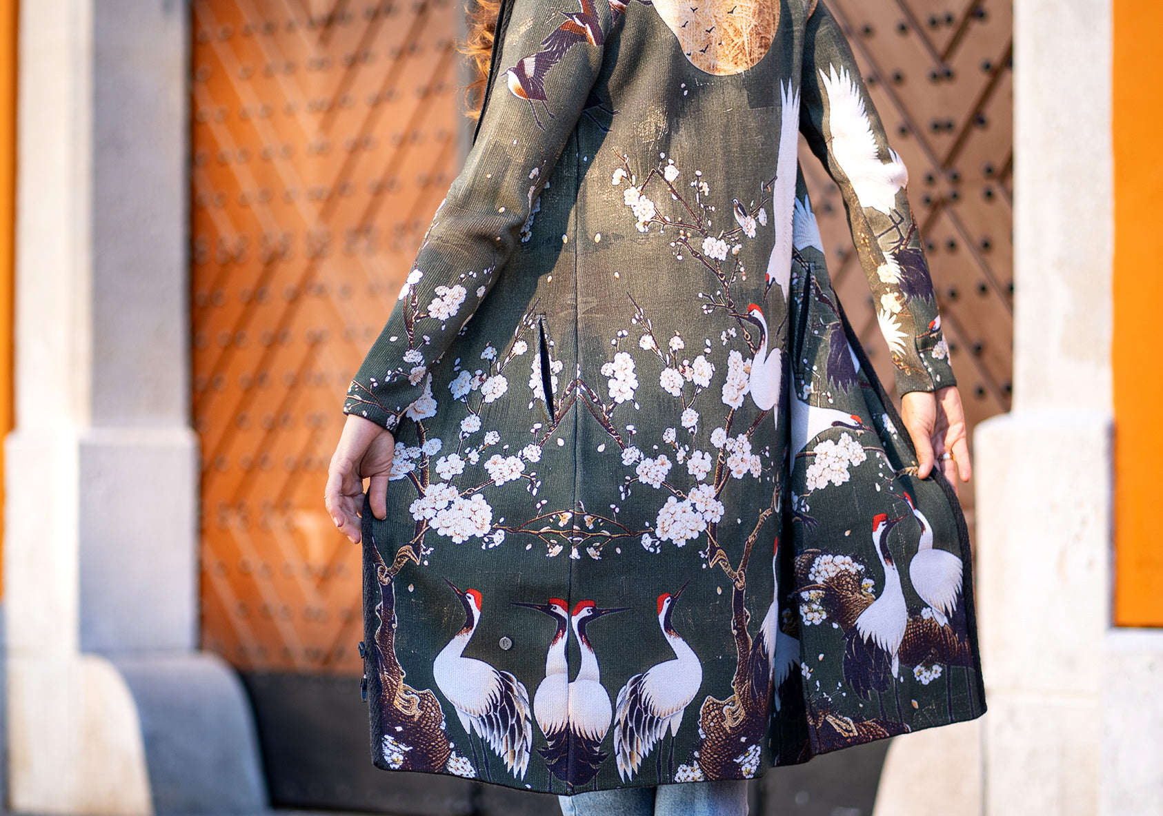 Művészi, mégis hétköznap-kompatibilis darab: a virágzó ágak és szárnyaló darvak mintája elegáns mozgást ad a sziluettnek, miközben a kötött kabát a pulóver/pulcsi kényelmét és a kabát tartását hozza az őszi–téli szezonra.