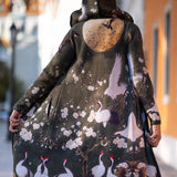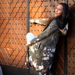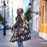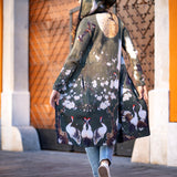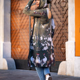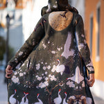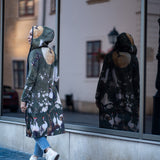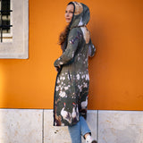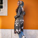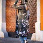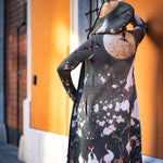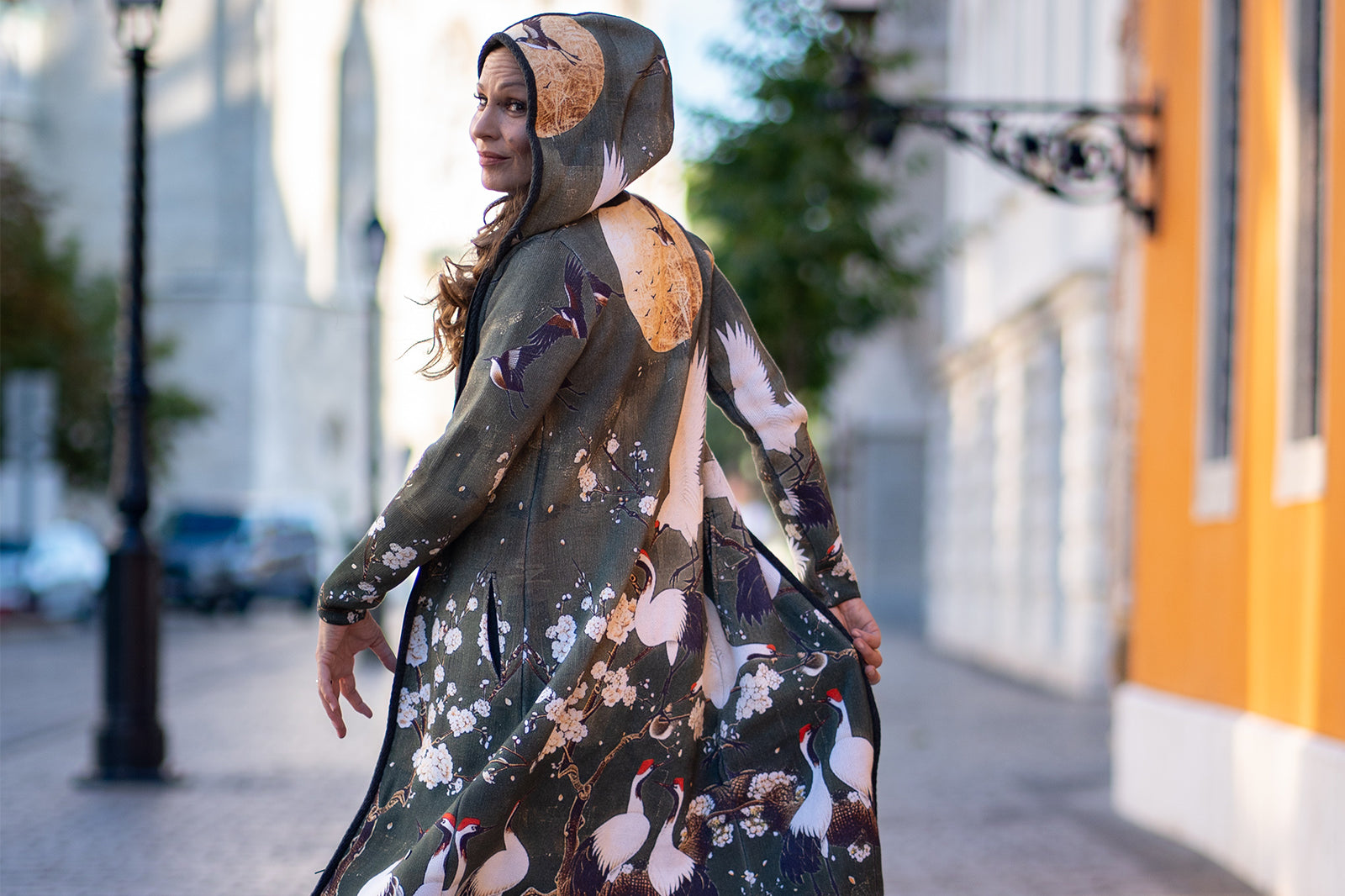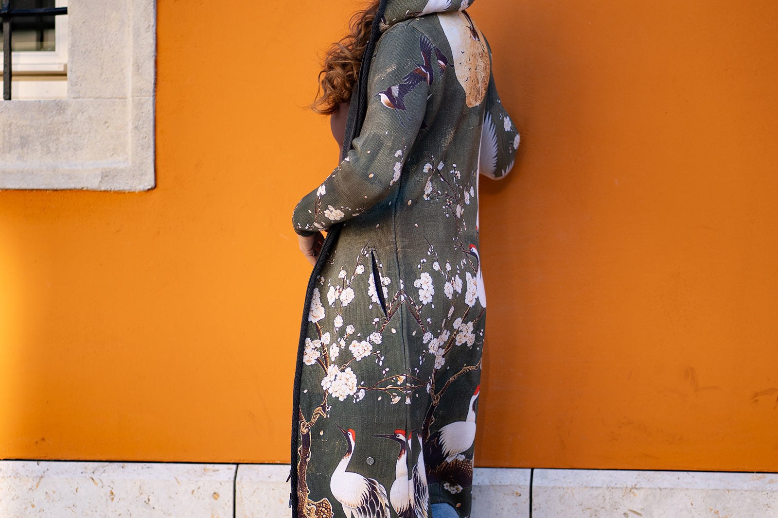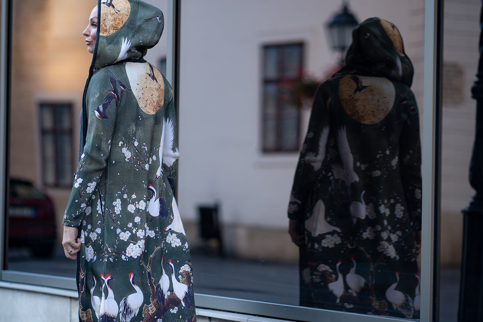 Művészi, mégis hétköznap-kompatibilis darab: a virágzó ágak és szárnyaló darvak mintája elegáns mozgást ad a sziluettnek, miközben a kötött kabát a pulóver/pulcsi kényelmét és a kabát tartását hozza az őszi–téli szezonra.