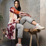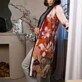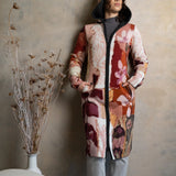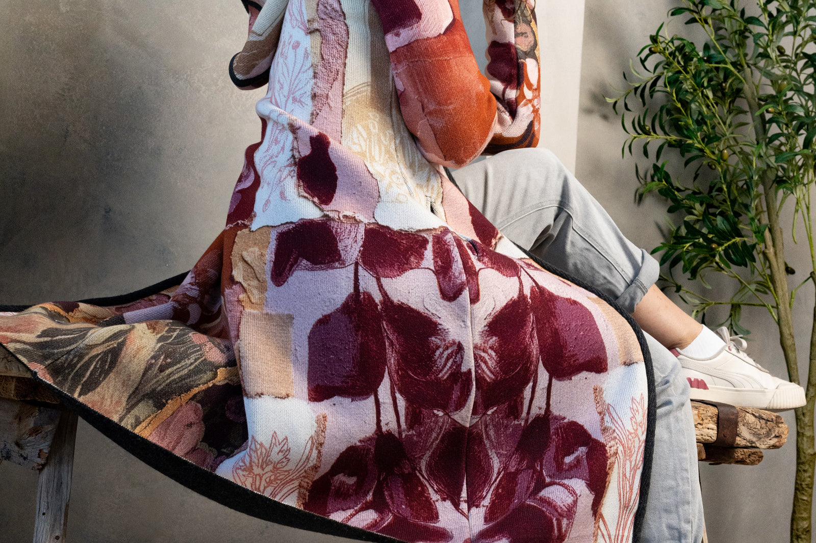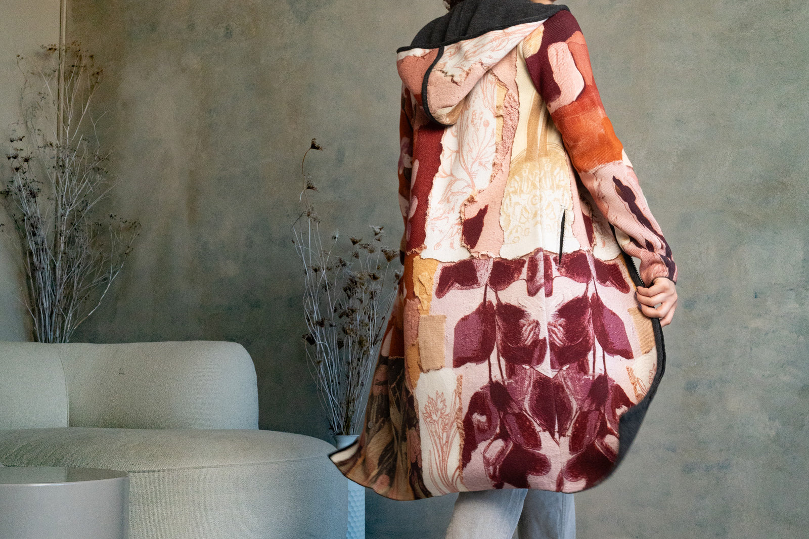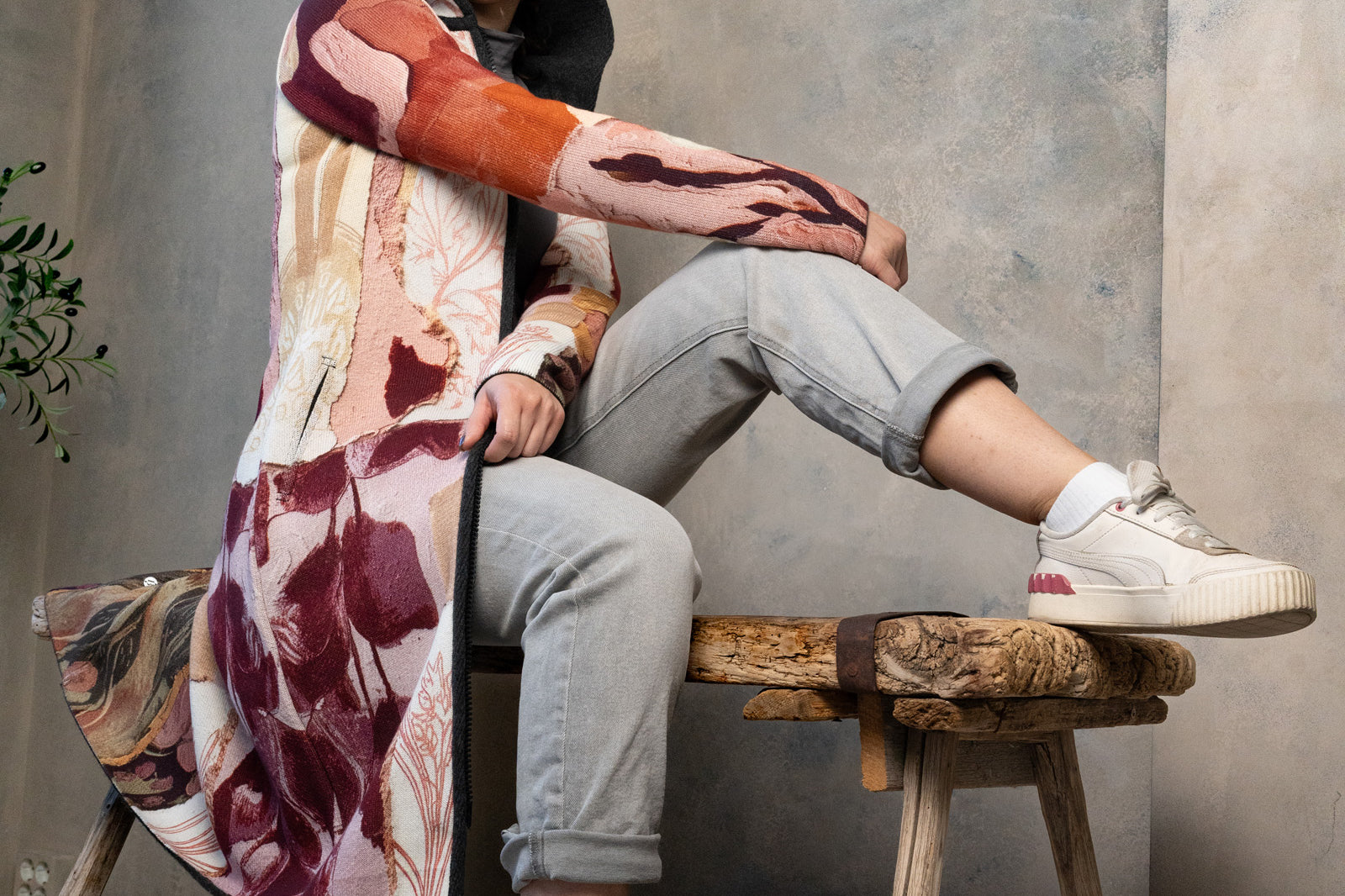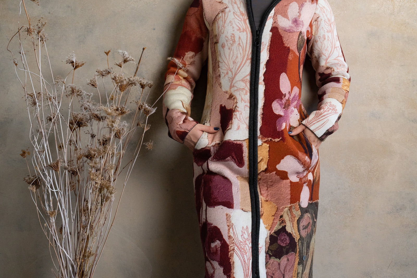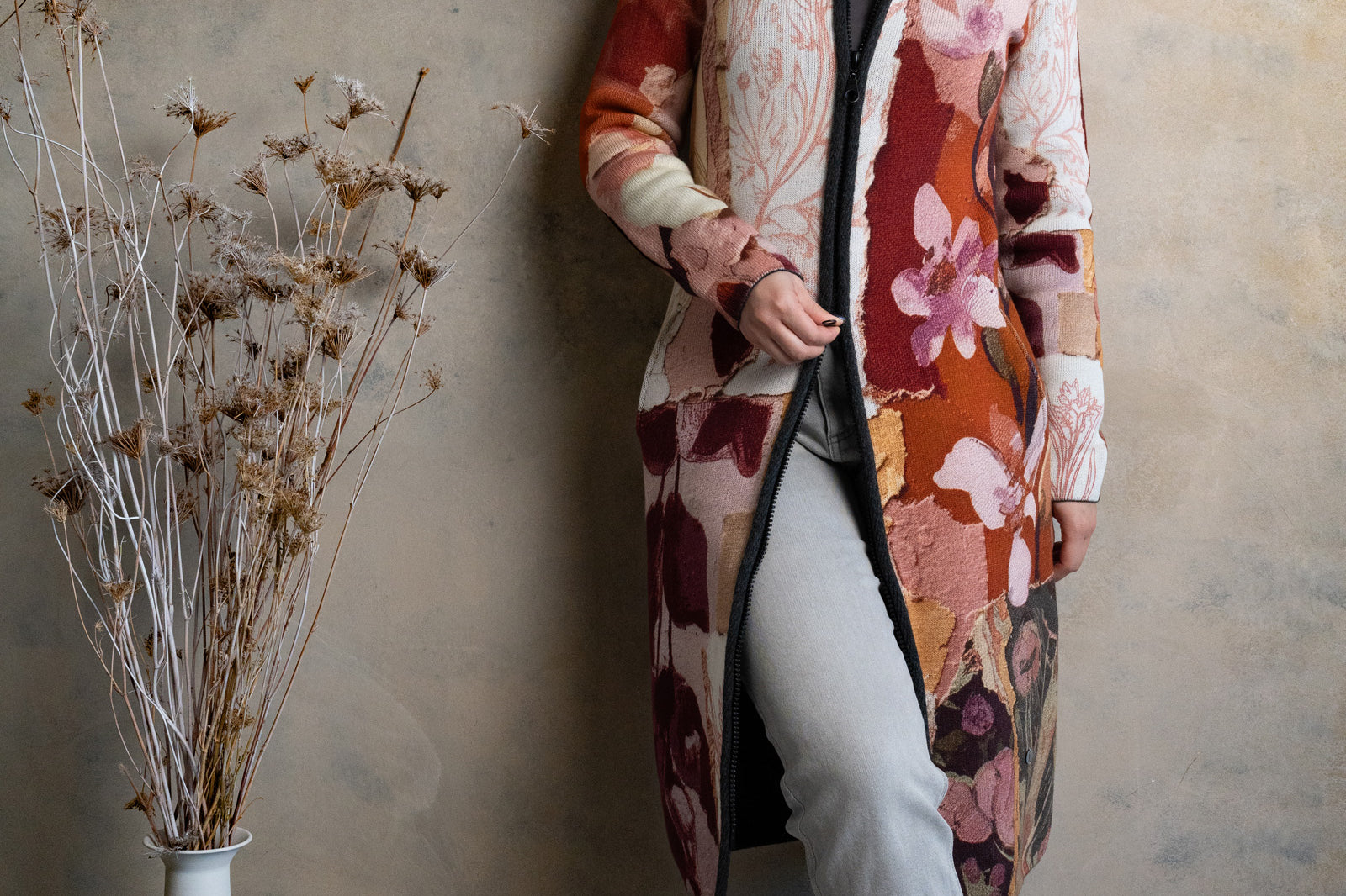 Rétegezett, művészi hatású virág- és textúrakollázs meleg tónusokon. A Kollázs Elegancia karakteres, mégis könnyen hordható kötött kabát – kabátként tart, pulóverként kényelmes; városban és utazásnál is működik.
