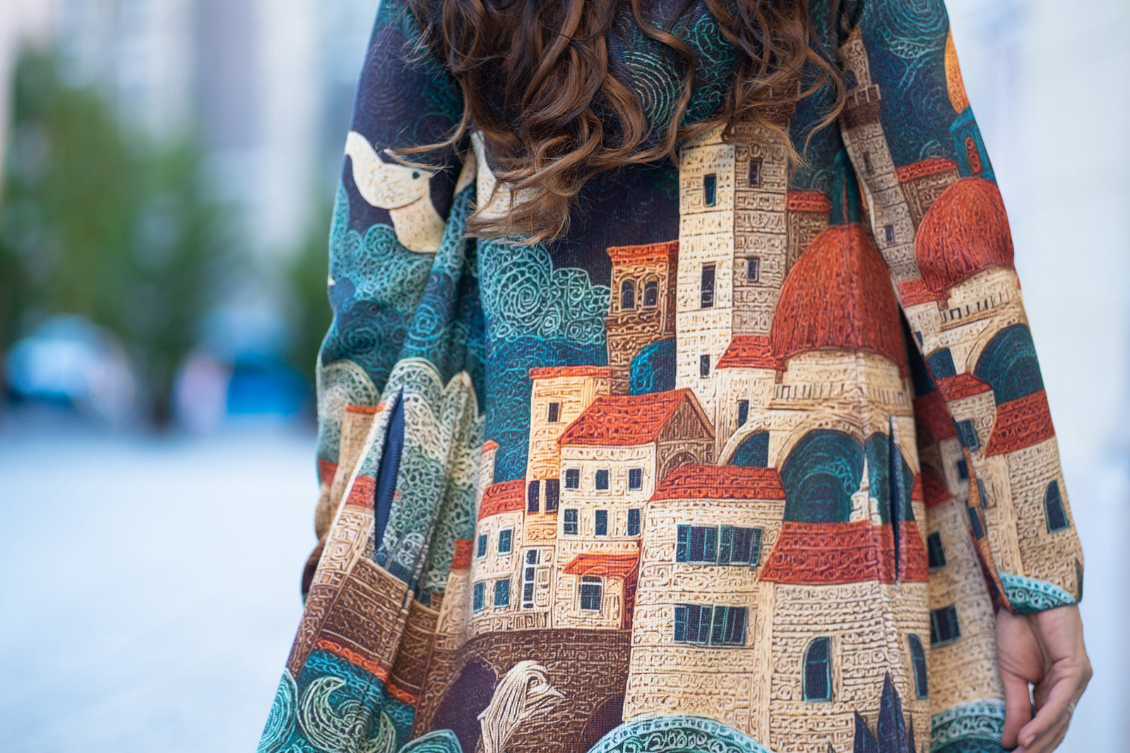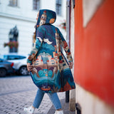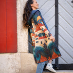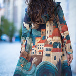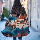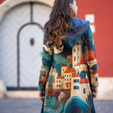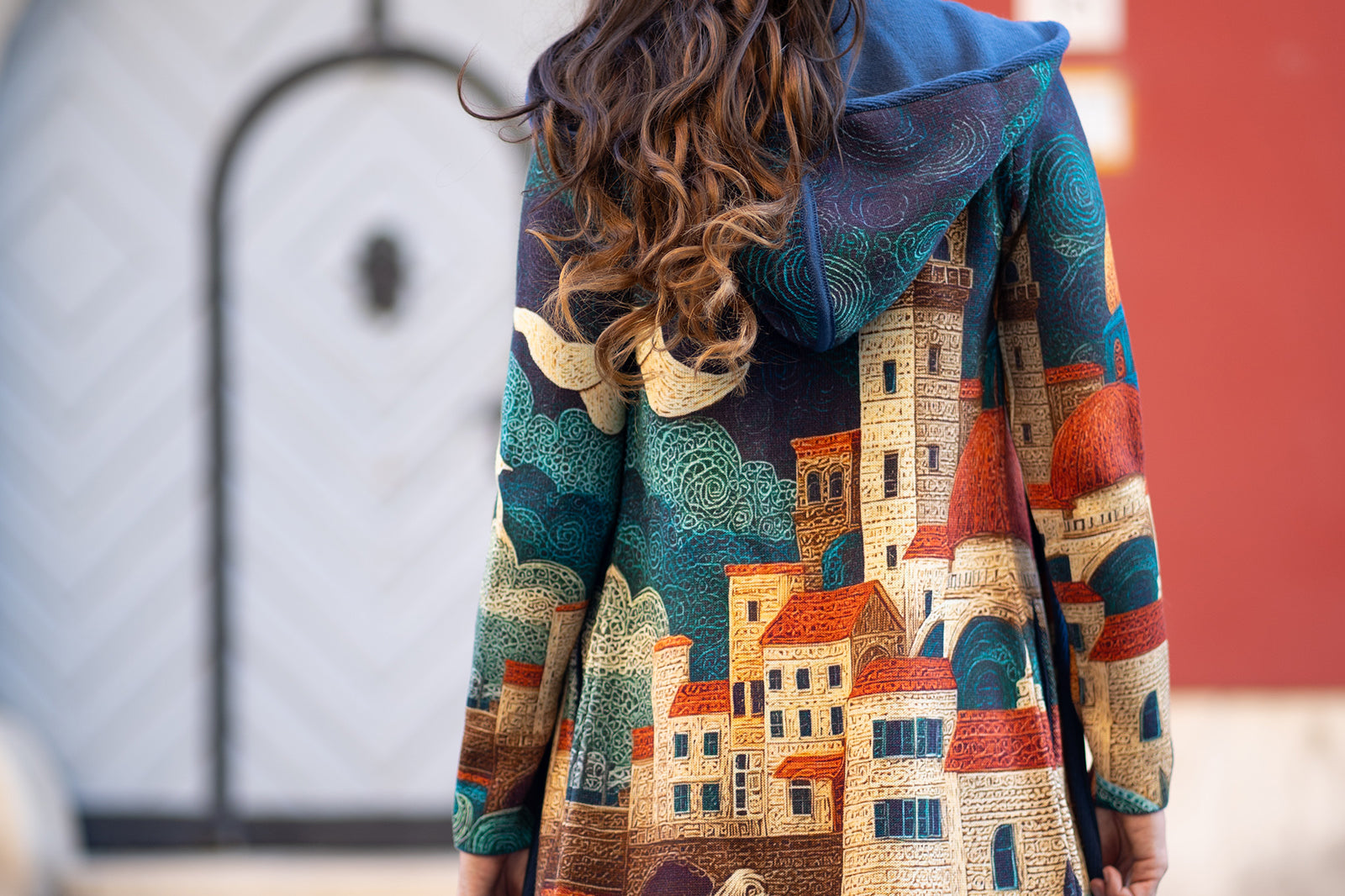Tengerillatú városkép terrakotta tetőkkel és türkiz hullámokkal: ez a kapucnis, cipzáras női kabát a pulóver/pulcsi komfortját és a kabát tartását egyesíti, így stílusos, meleg és könnyen rétegezhető választás a hűvös, városi napokra.