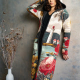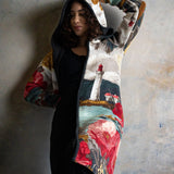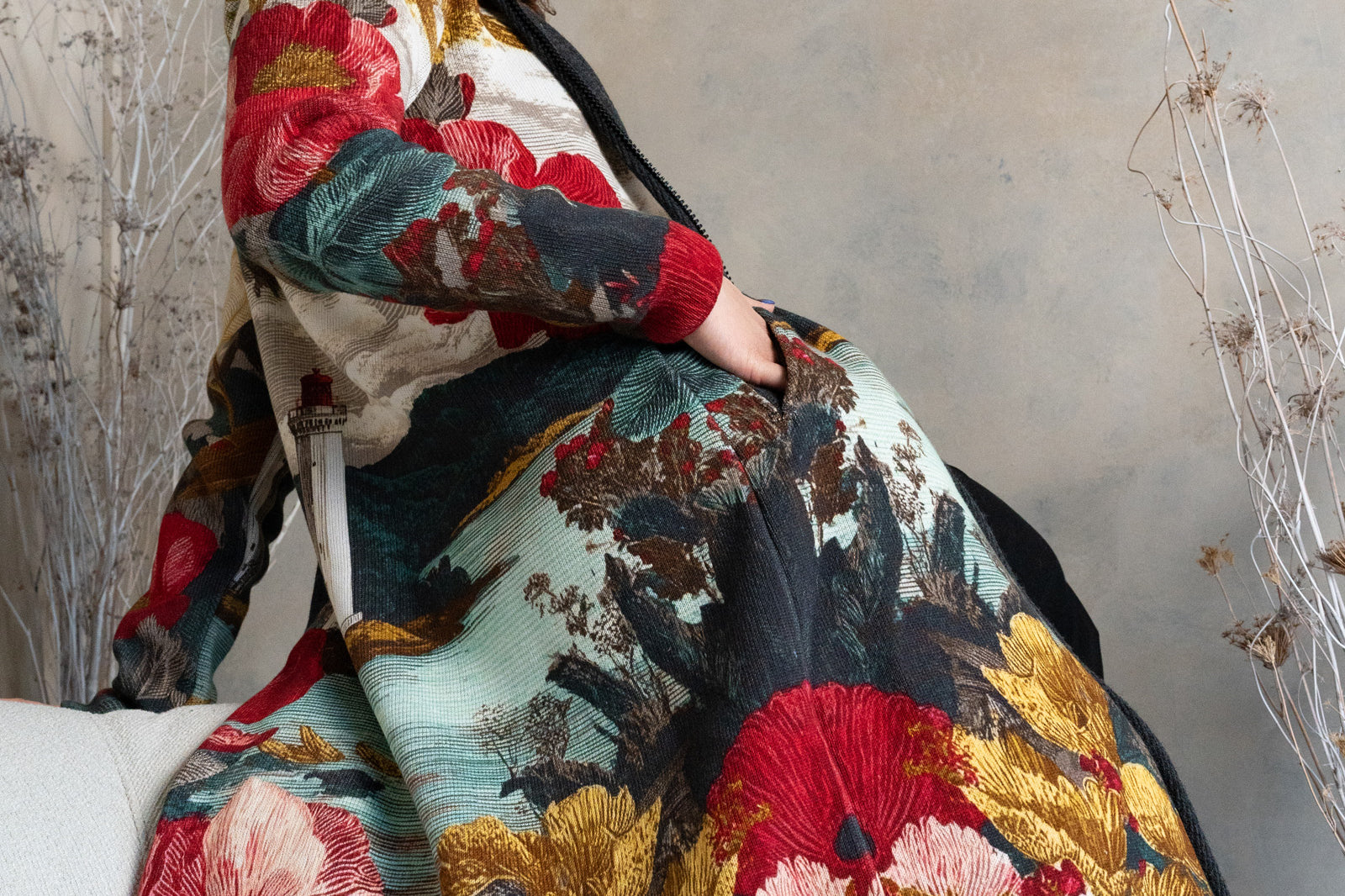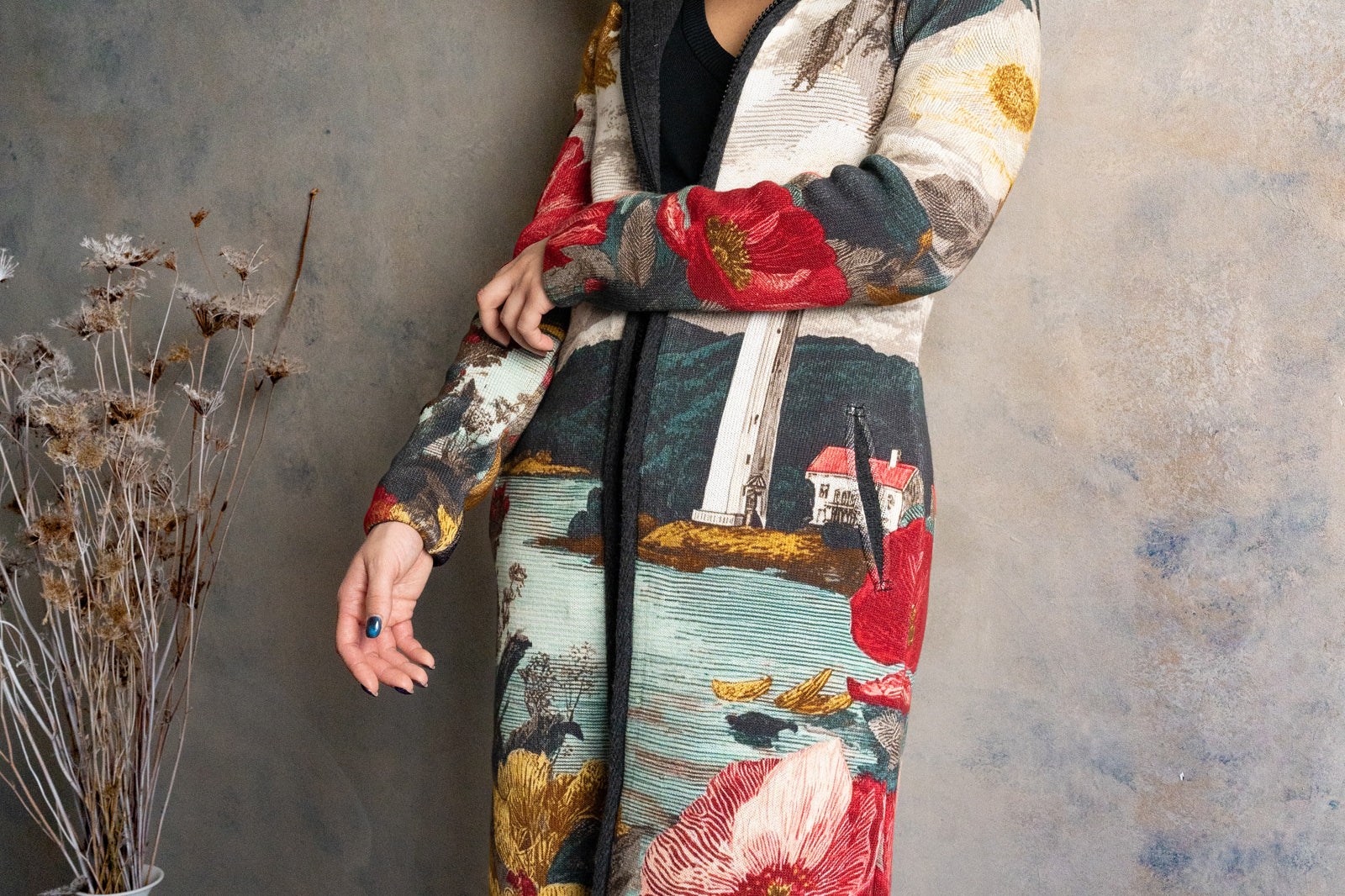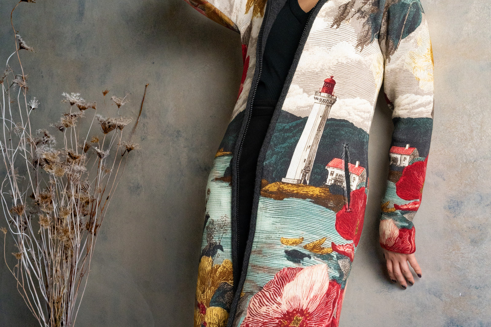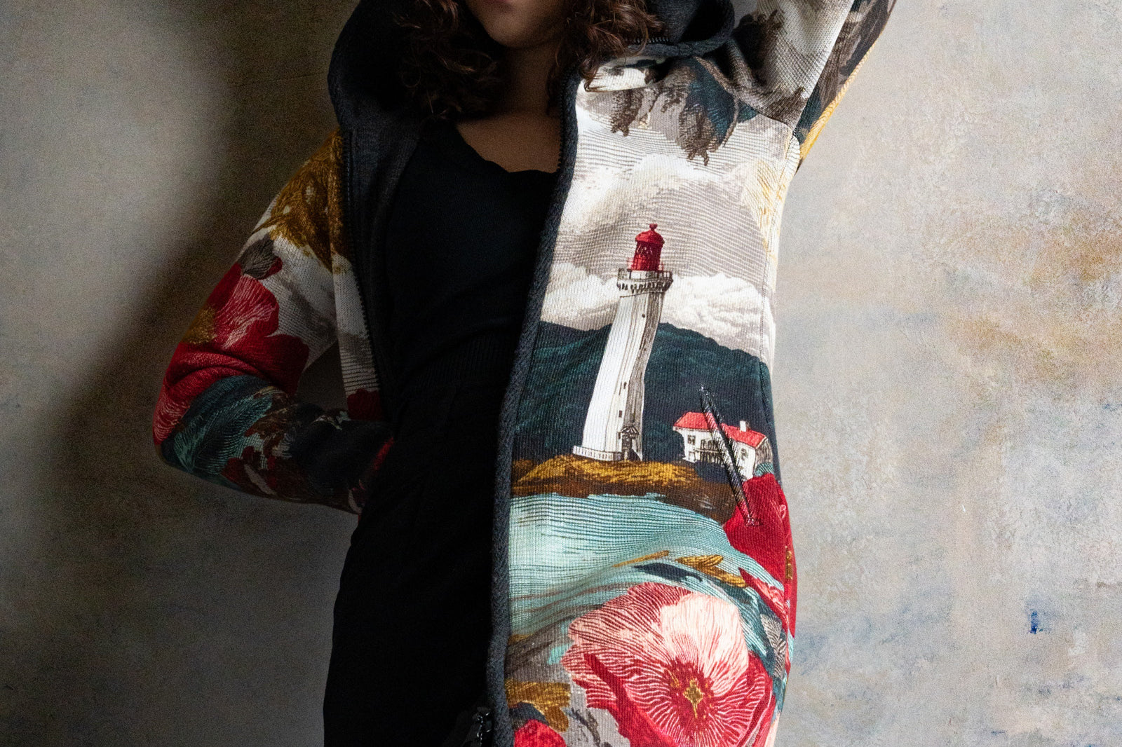 Városi-minimál találkozik tengerparti hangulattal: világítótorony-grafika, finom arany részletek, karakteres virágmotívum. Kapucnis, cipzáras kötött kabát, ami kabátként tart, pulóverként kényelmes – gyorsan hordható, egész nap vállalható.