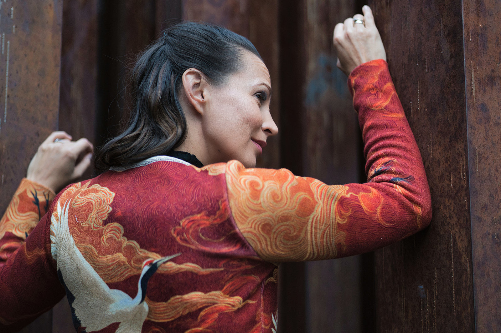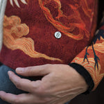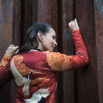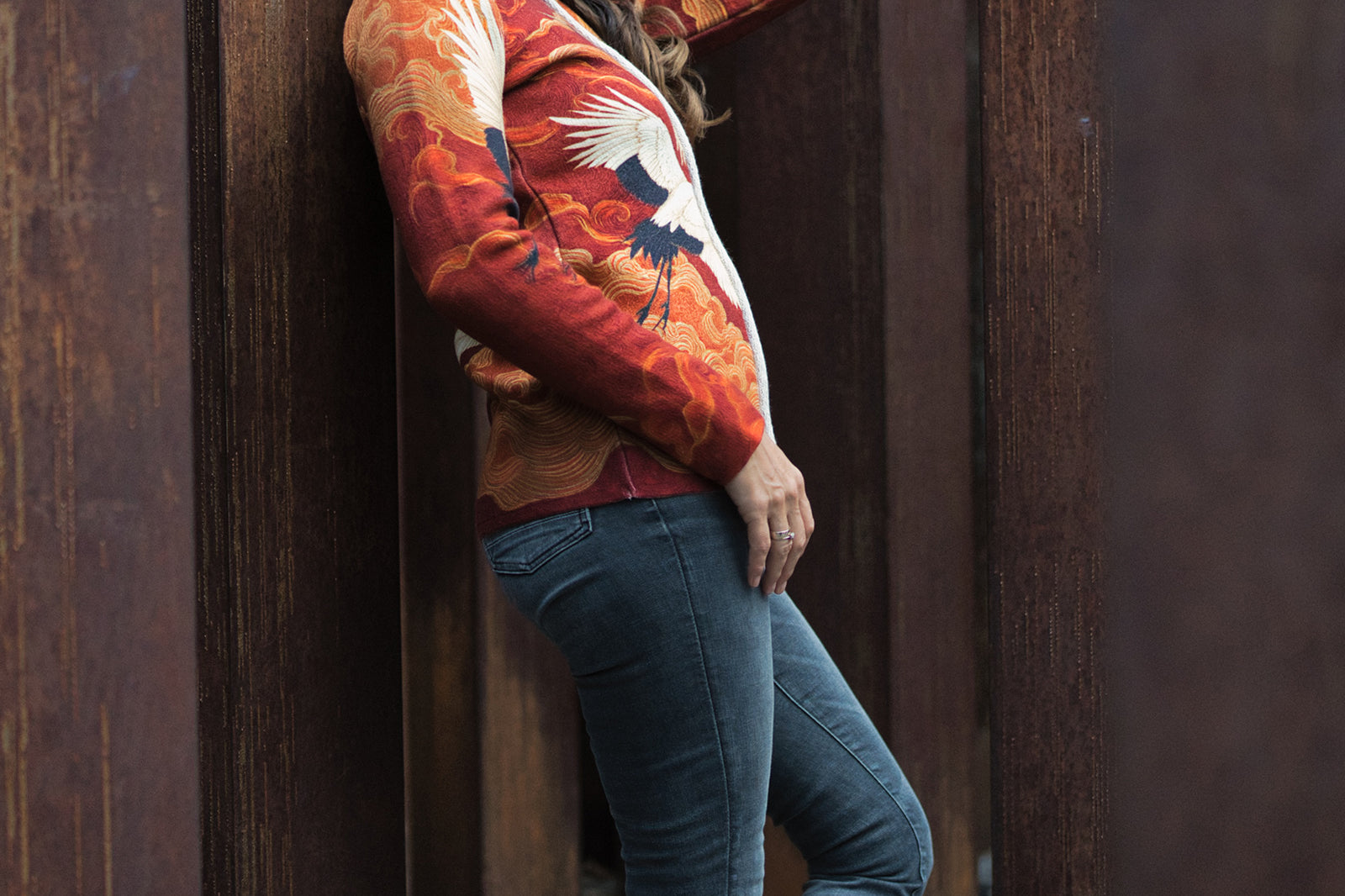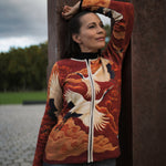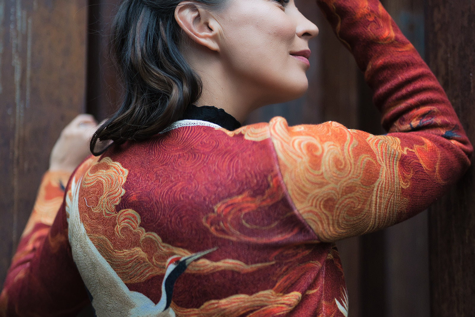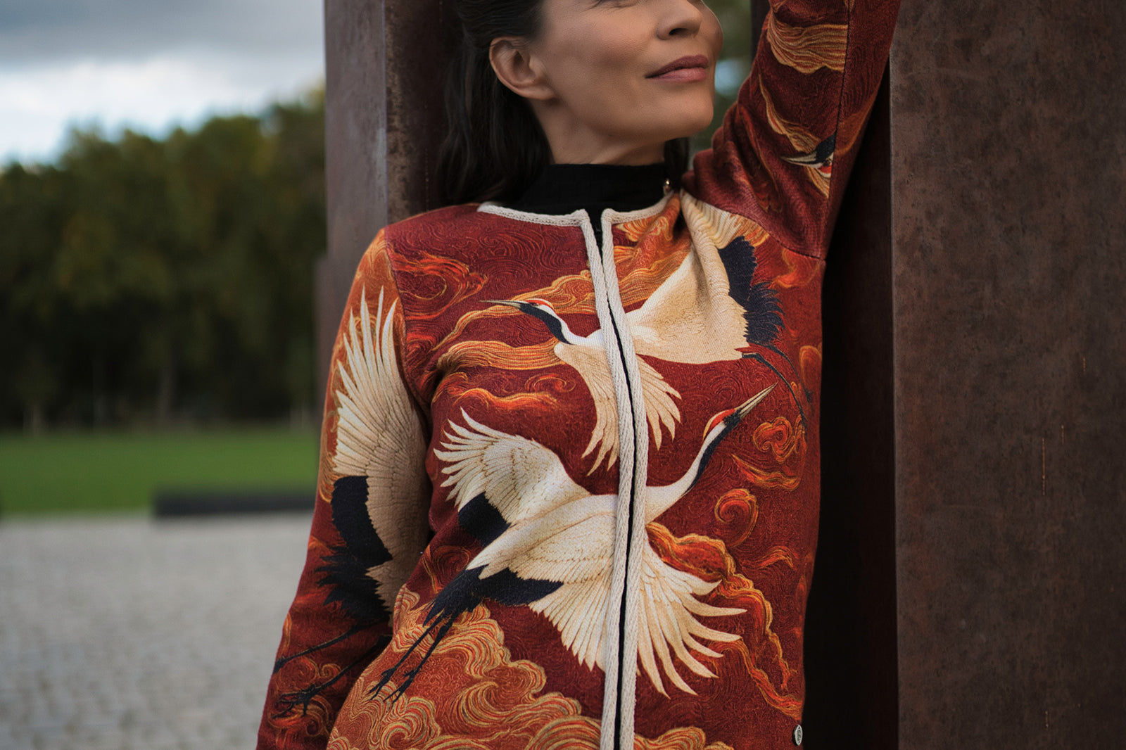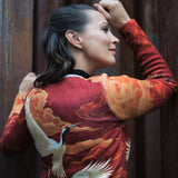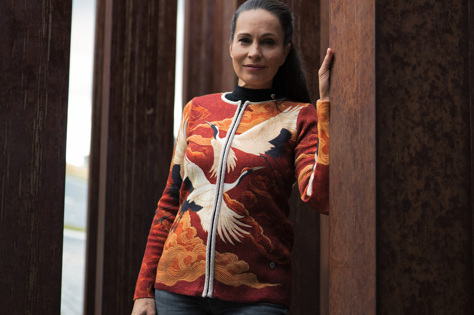 4. Ikonikus minta – a vörös daru motívum karakteres, mégis elegáns; egyedi mintás női kardigán, amely biztosan kitűnik.